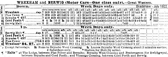 The July 1922 Bradshaw shows weekday departures from Pentresaeson Halt for Berwig Halt at 7:59am, 10:04am, 2:26pm and at 3:44pm. Services operated to Coed Poeth at 12.49pm, 5.06pm, 6.11pm, 7.14pm, 8.17pm and at 9.21pm. There were departures for Wrexham General at 8:23am, 10:30am, 1.15pm, 2:50pm and at 4:07pm, 5.13pm, 6.17pm, 7.20pm, 8.24pm, and 9.27pm. On Saturdays timings were altered in the afternoon.