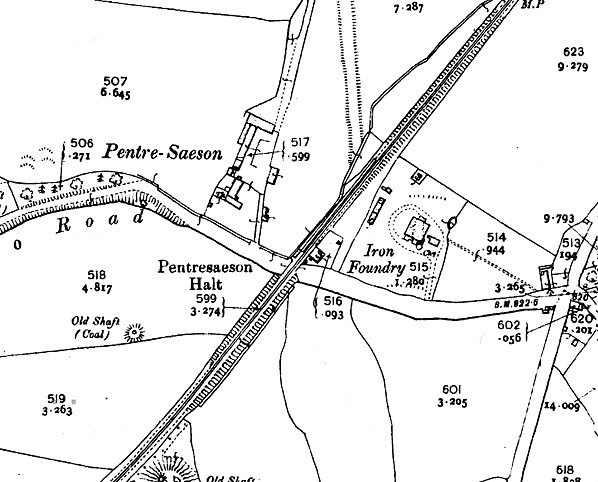 Notes: Pentresaeson Halt was situated on the Wrexham & Minera Railway which in its original form ran from a junction with the Chester and Shrewsbury line north of Wrexham called Wheatsheaf to a limeworks at Minera. The line opened in July 1847 and passed through the Moss Valley and Brymbo areas that had mines and ironworks. The line had two very steep rope worked inclines and two tunnels between Wheatsheaf Junction and Brymbo which were a hinderance once traffic levels built up. To solve the problem the Wrexham & Minera Railway (W&MR) company was incorporated on 17 May 1861 to build a three mile line from the Chester and Shrewsbury Railway at Croes Newydd to the original Minera line at Brymbo. The line opened as a single track branch on 22 May 1862 for goods services only and it was able to be worked by locomotives throughout. The original line closed between Brymbo and Moss but the rope worked incline on the east side of the Moss valley remained in use until 1908.
