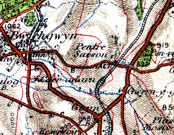 Pentresaeson Halt opened on 20 March 1905 when the passenger service was extended to Coed Poeth and given over to ‘railmotor’ operation. Located on the north-east side of a level crossing, the halt was a simple affair. The platform, on the up side of the line, was a simple timber structure. Early maps appear to show no buildings, but the halt eventually had a corrugated iron booking hut and shelter. It was usually unstaffed, but in 1924 it was the practice for a porter from Wrexham to issue tickets from the halt on Saturdays. The halt served a sparsely populated area and took its name from the farm a short distance to the north-west– which, translated, is ‘Englishman’s village’.