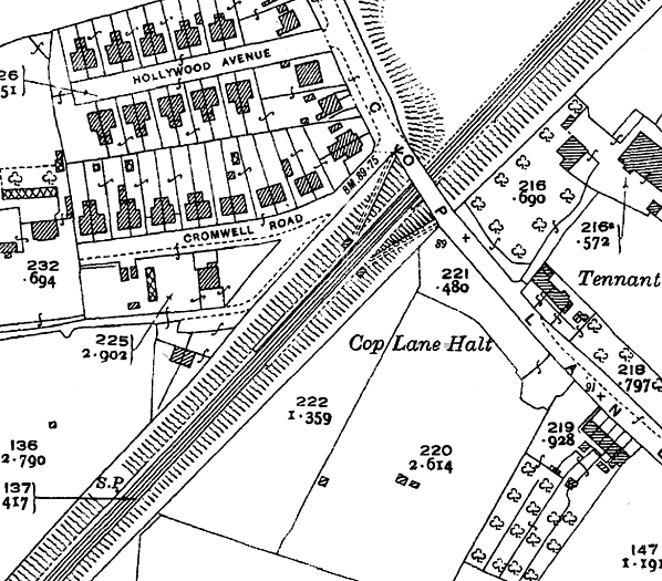 are clearly shown. Copyright photo from Stations UK ![]() ![]() 1933 1:2,500 OS map clearly illustrates the simple nature of the facility. The reason why the LYR provided it can be seen from the nearby housing developments. The station was originally called Cop Lane Halt.