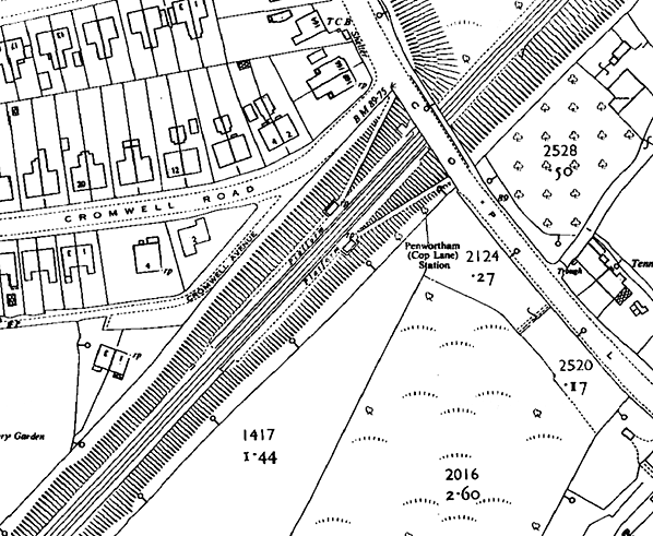 ![]() 1960 1:2,500 OS map. From 30 March 1940 the station had been named Penwortham Cop Lane as shown on this map.