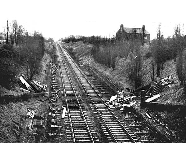 Photo by Alan Castle ![]() The scene of destruction at Penwortham (Cop Lane) in January 1965, only 19 weeks after the passage of the last train. Due to the high fire risk from the all-timber construction, official vandalism has precluded the informal vandalism which would have sealed the fate of the closed station. Today the lanes of the Penwortham bypass sprawl across the site; all traces that a railway ever ran here have been totally and, very efficiently, obliterated.
