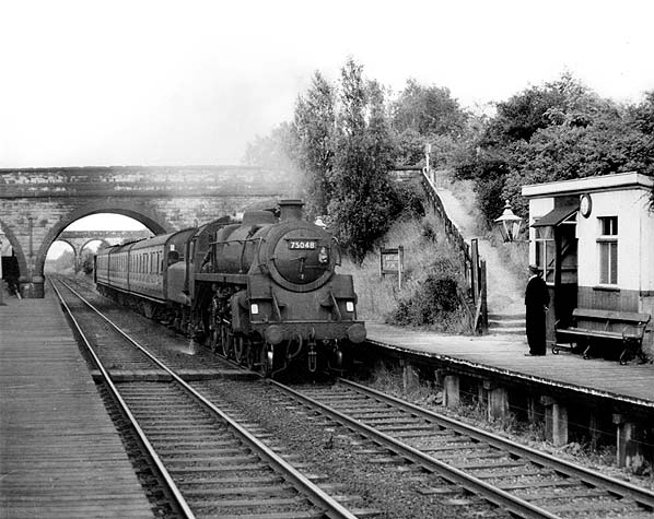 Photo by Alan Castle ![]() On this occasion with no custom to offer, Penwortham (Cop Lane)'s long-serving and very amenable porter-cum-ticket clerk, Frank Taylor, awaits the arrival of the 6:12 pm commuter service from Preston to Southport. Cop Lane, like Longton Bridge, comes under the control of the stationmaster at New Longton & Hutton and, in the deep cutting well below the public highway, the single member of staff on duty here might feel particularly isolated. Frank, however, lived close to Middleforth Junction, a short distance away; as there was no electricity supply in the booking office, in the sometimes lengthy intervals between trains he found it convenient to nip home on his motor-cycle for a crafty ‘cuppa’. Indeed, there were occasions in his absence when the photographer (who had become a close friend) was deputised to collect tickets on his behalf from any alighting passengers. As a consequence of this, it can now be revealed after the passage of so much time that this person now has a ticket collection to be admired! 75048 was built in 1953 to Riddles' Standard Class 4, 4-6-0 design at Swindon works. It entered service in the October at 24A, Accrington shed until November 1955, when it moved to 27A, Bank Hall. Following spells at Chester, Croes Newydd and Lostock Hall, it was transferred to 10A, Carnforth in June 1967 from where it was withdrawn in August 1968 and scrapped by Campbells of Airdrie in November of that year.