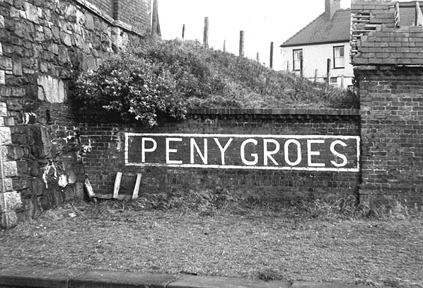 The painted Penygroes station name that was to the north of the station building on the down platform seen in December 1972. Photo by John Mann