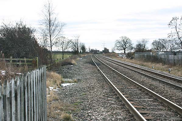 Looking south from the level crossing in February 2009. The signalbox was on the left and the goods yhard was behind the fence on the right.