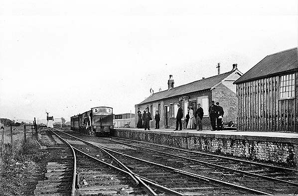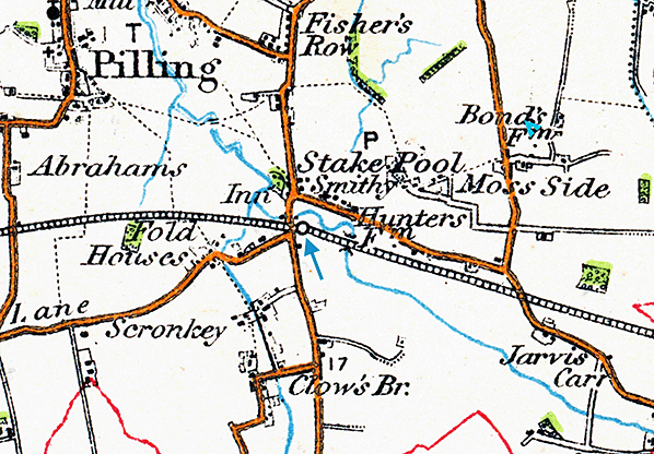 Pilling station was located over a mile to the southeast of its namesake at the small settlement of Stakepool. The station was situated to the east of a road junction where the route from Cockerham to Knott End was joined by a minor road from Eagland Hill. There was a single platform on the south side of the line, a timber station building and a run round loop. Goods facilities were located to the south of the passenger platform and consisted of two sidings and a yard. An interesting feature was that line extended across the road for a short distance. In order to run around their trains engines had to pass onto the public highway. Whilst a crossing keeper’s house was provided, also on the south side of the line, there did not appear to be any level crossing gates in the early years.