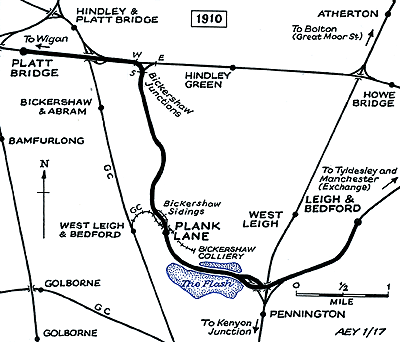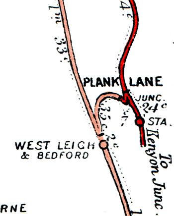 Just to the north of the station the Great Central Railway (GCR) Bickershaw Branch passed under the LNWR line. The branch provided a link between the GCR Glazebrook and Wigan line and the Bickershaw colliery. The Glazebrook and Wigan line which had opened on 16 October 1879 was only a short distance to the west of Plank Lane station. It had its own station on Crankwood Lane which was called West Leigh & Bedford.
