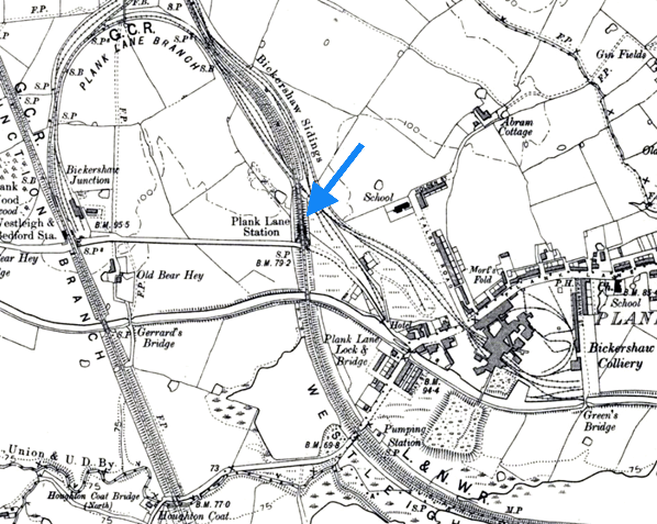 Plank Lane station was opened on 1 October 1903. It was located just to the north of the Leigh branch of the Leeds & Liverpool Canal to the north-west of Bickershaw colliery and the small settlement of Plank Lane. Crankwood Road passed under the line which was on an embankment at this point and the station was on the north side.
