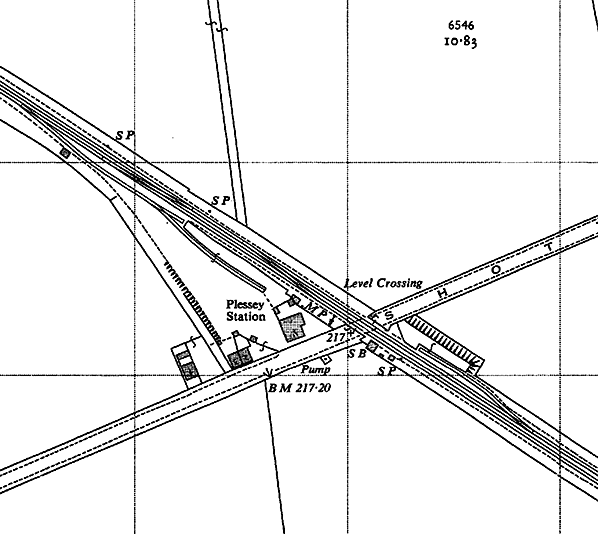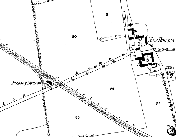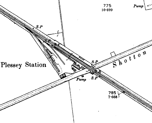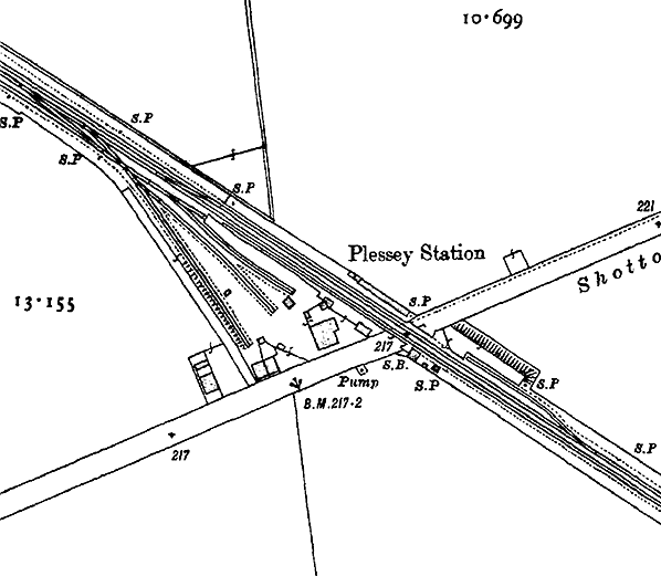 Two sidings were shown at Plessey in the LNER diagram of the line drawn in 1934. One had a trailing junction with the up line south-east of the level crossing, while the other was north-west of the crossing, having a trailing junction with the down line and a headshunt.
