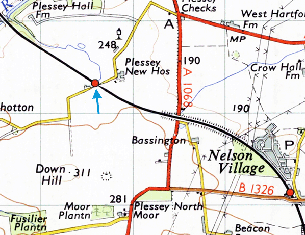 Notes: Plessey is at the very margin of the deep coal mining area of south-east Northumberland. Small coal mines operated near Plessey Checks and New Houses, but they had ceased production by the early nineteenth century and they left little trace on the landscape. Numerous larger shaft mines with their attendant pit-heaps (the man-made mountains of waste materials) and sprawling villages of terraced housing dominated the landscape as close as Cramlington and Dudley, but into the twentieth century Plessey remained a rural agricultural area with scattered farmsteads. In the station’s later days some opencast mining was carried out a short distance to the north and south – see the OS 1953 map; and since the station closed, the rural isolation has been lost as further opencast coal mining and the expansion of Cramlington’s industrial estates have transformed the landscape. Only to the north are there still quiet fields. There is now no village of Plessey, but a ‘deserted medieval village’ site has been identified about ¾-mile north-west of the former station, just east of Plessey Hall Farm. The name is carried by a few other buildings in the locality as well as by the attractive Plessey Woods (now a Country Park) in the valley of the River Blyth over which the East Coast main line passes on a viaduct.
