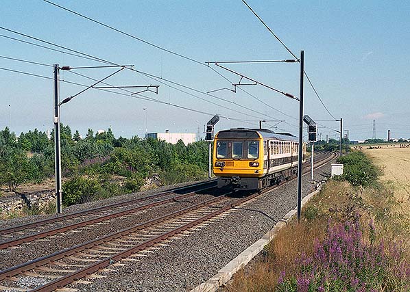 ![]() In August 1995 a northbound ‘Pacer’ DMU approaches the former level crossing at Plessey. The station site is behind the photographer. Cramlington industrial estates are visible in the distance.