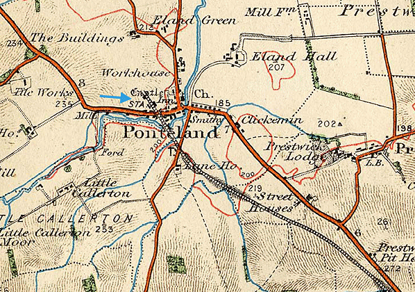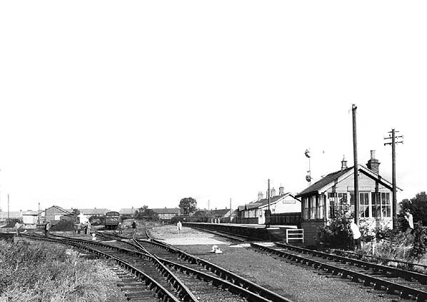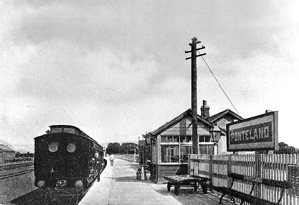 Notes: The branch terminus, situated 6 miles 68ch from the junction at South Gosforth, possessed a single platform on the up side of the tracks and an extended version of the single-storey timber building found at the intermediate stations on the branch. A glazed verandah stretched for about two-thirds of the length and was decorated with two cross-gables. A low timber signal box stood at the southeast end of the platform. This was the busiest station on the branch issuing 32,084 tickets in 1911. The building survived into the 1960s: the last passenger train to arrive at Ponteland was the Five day North East Railtour on 29th September 1963. The station remained open for goods traffic until 14th August 1967 with a private siding remaining after that date but by the mid-1970s the station had been entirely removed.