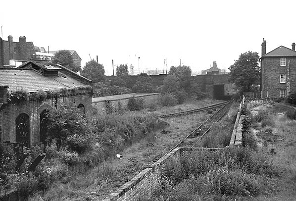 The site of Poplar (1st) Station looking west in October 1967. The building on the left was nothing to do with the railway and was built after closure of the station. It probably housed hydraulic pumping equipment for the docks.