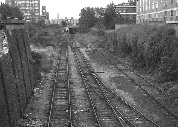 Looking north towards Poplar Station from Poplar High Street bridge in 1977