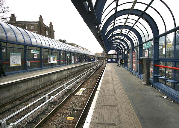 The DLR's All Saints Station in March 2009. Poplar High Street bridge can be seen in the background.
