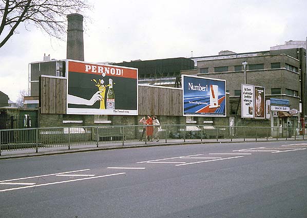 Poplar Station in c.1970's. Part of the front wall with blocked doorways and windows is all that remains of the roadside building.