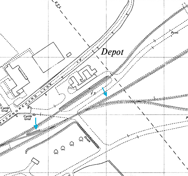 Photo by Andy Crespin ![]() 1965 1:2,500 OS map with the site of Port Gate Platform indicated. The original position of the halt is on the left. Some time after 1975 a new halt was provided to the east (second position). Apart from Model Room and the original Port Gate Halt none of the other halts on the Marchwood Military Railway have been shown on OS maps. The main entrance to the port off Cracknore Hard Lane is seen on the left. The halt was to serve people living in McMullan Barracks part of which is seen opposite the port entrance.