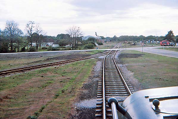 ![]() The view from the footplate of Ruston & Hornsby Army No.432 as she truddles along the Marchwood Military Railway towards Main Road crossing and Port Gate Halt in September 1975. In the centre distance can be seen the locomotive shed and behind it the raised jib of the breakdown crane. The halt is seen on the right just beyond the road. This is the original position of ther halt, it was later moved to to where the locomotive is standing.