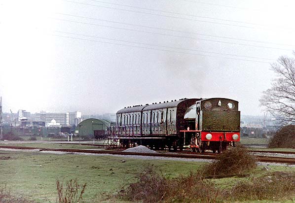 Photo by Andy Crespin ![]() No.92 with the lunchtime passenger train at Port Gate Platform, a very rudimentary structure but one which no doubt served its purpose adequately, in February 1976. The train is formed of two of the ex-BR London Midland Region 57ft suburban coaches, both being brake-end vehicles. Slightly amusingly, No.92 carries a lamp in the position which on the main line would signify a local passenger train - which technically is what the Marchwood passenger service was. Southampton can be seen