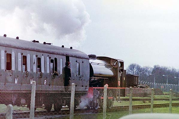 in the background. Photo by John Graham and courtesy Andy Crespin ![]() No.92 scuttles away from Port Gate Platform towards the Married Quarters with the lunchtime passenger train in February 1976, prior to the platform being relocated to the east side of the road. The train is formed of two of the ex-BR London Midland Region 57ft suburban coaches, both being brake-end vehicles and both branded MMR at this time with at least one, it is believed, having come to Marchwood via Longmoor. Note the van in the background; it appears not to be grounded but on the elevated track of the coaling stage.