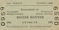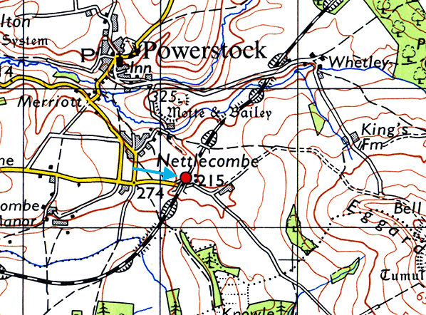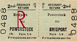 Notes: Powerstock station was shown as ‘Poorstock’ in both GWR and Bradshaw timetables until 1860. It took its name from a small village about a mile to the north, but also served Nettlecombe – a hamlet on the road from Powerstock – and some isolated farms.