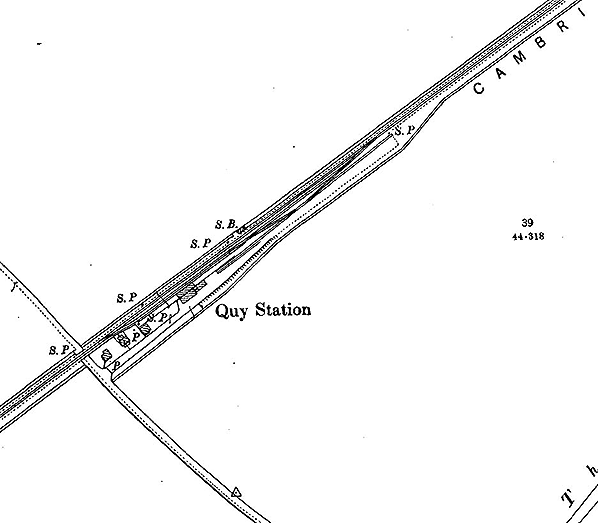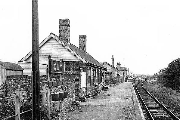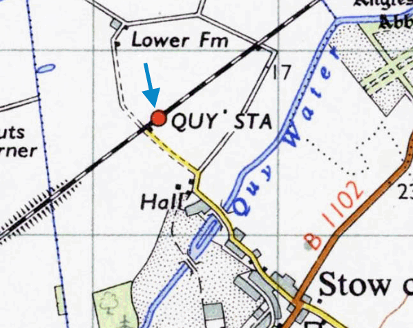 Notes: The village of Stow-cum-Quy is invariably referred to simply as 'Quy' and pronounced as in River Kwai. Quy station was 4½ miles from Cambridge by rail and about two miles outside the city boundary. The village is served by the B1102 road and is adjacent to what is today the A1303 (the old Newmarket Road, once the A45) and the A14. Quy station was a different matter entirely; located towards the end of Station Road, which continues beyond the station site as a farm road, it was inconveniently located in open country ¾-mile from Quy crossroads and just over one mile from the village-proper.
