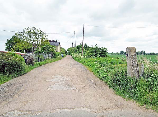 Looking north-east along the station approach road from Station Road in May 2015. A railway gate post is still in place.