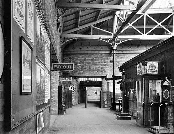 ![]() The booking hall at Radcliffe station looking east in 1916. The main entrance is to the left. The subway that provided access to platform 4 can be seen in the distance.