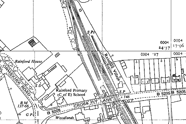 Rainford Village station after closure to passenger services but when still open for goods in 1960 shown on a 1:2,500 scale map.