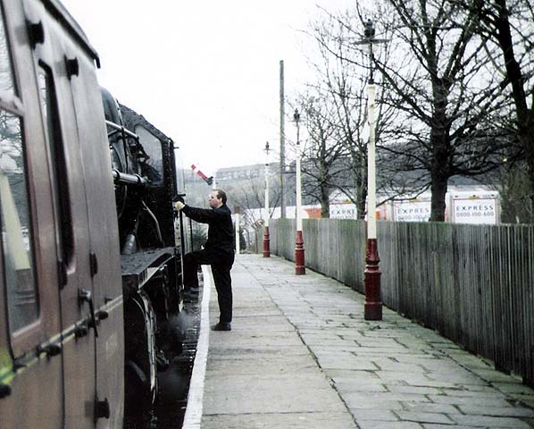 ![]() Looking south from the southern end of the northbound platform at Ramsbottom station in February 2000. Disused Stations North West reporter Paul Wright prepares to take a former LMS Class 5MT (Black Five) on a train of four coaches southwards to Bury as part of a driver experience day. The trees to the right of the picture are located on the site of the original goods shed at Ramsbottom that was demolished in 1969.