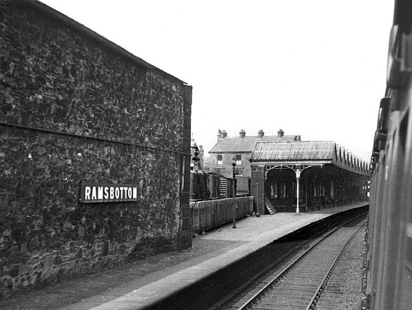 ![]() Looking north at the northbound platform at Ramsbottom from a passing train in April 1951. To the left of the picture is the stone built goods shed with the station nameboard attached to it.