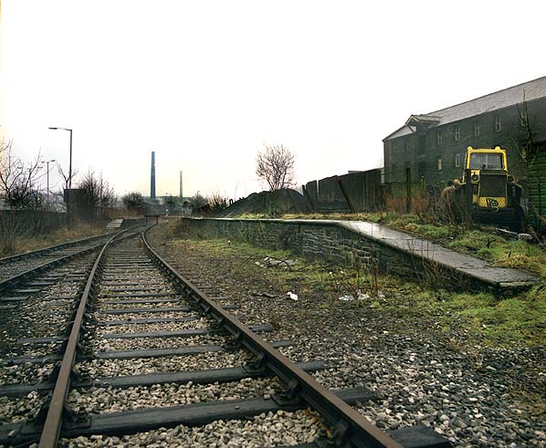 ![]() Looking northeast at Rawtenstall station in February 1983. At this time the station's platforms were both extant in their original form. As can be seen in the picture the up platform, to the right, was longer than the down platform, to the left. The platform to the right was kept in use after passenger services ceased to run to Bacup in 1966 and Rawtenstall became a terminus. After the remaining passenger services finished in June 1972 the line was cut back to a simple headshunt which is shown in the picture. Behind the photographer was the coal depot which remained rail served until 1980.