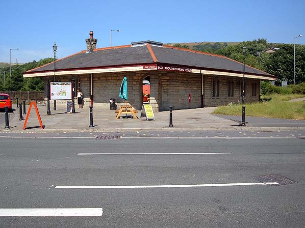 ![]() The replica ELR station building at Rawtenstall in July 2006. The building sits accross the trackbed of the Bacup line and opened to the public in 1992. The original stations platforms had continued beyond the grassed area to the right.