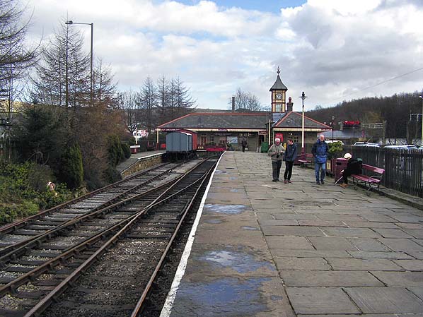![]() Looking northeast in March 2008 along what had been before 1966 the southbound platform at Rawtenstall Station. The platform's original southern end had been just behind the photographer and it had previously continued beyond the station building which was opened in 1992 and which sits across the trackbed. The former northbound platform was shorter that the southbound and its surviving section can be seen on the left.
