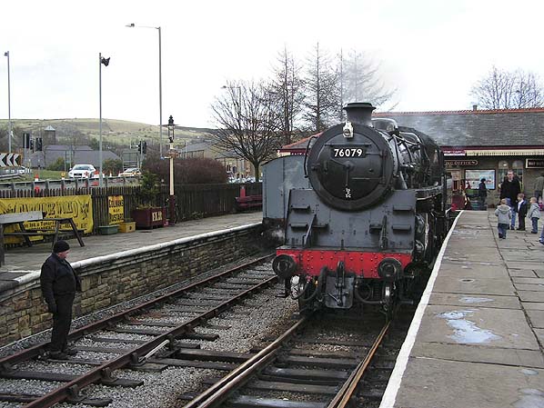 ![]() Looking northeast at Rawtenstall station in March 2008. To the left can be seen the surviving section of the former northbound platform. The building in the background was opened in 1992 and sits across the original trackbed. 76079 was built at the Horwich works of the former Lancashire and Yorkshire Railway in February 1957. From September 1968 it remained at Woodham's scrap yard at Barry in South Wales until July 1974 when it was purchased for restoration