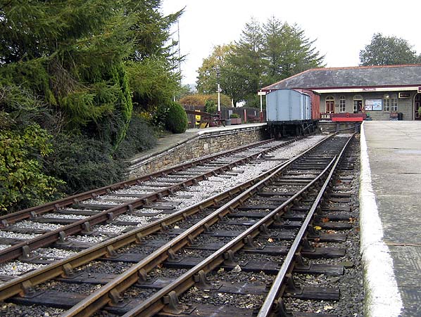 ![]() Looking northeast at Rawtenstall station in October 2010. The platform to the left is the remaining section of the down (to Bacup) platform. The station building was constructed in 1991 in the style of an ELR station. It sits accross the original trackbed.