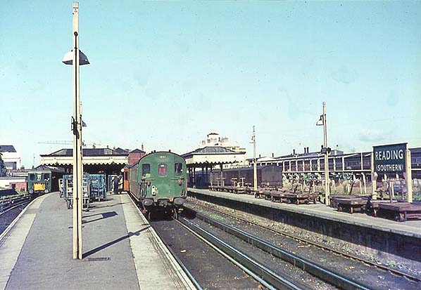 ![]() A Class 206 Tadpole DEMU No 1201 (right) awaitis departure for Guildford and Redhill at Reading Southern in the 1960s with a Waterloo 2-HAL EMU waiting on the left.