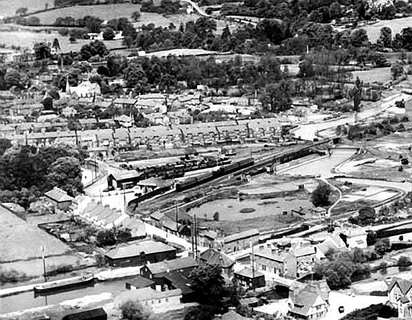 Aerial view of Rickmansworth Church Street station in 1921. Chess Basin and transhipment wharf are seen right of centre. The gravel pit to the south of the station is now filled with water. Town Wharf can be seen above the two rows of houses in the centre.
