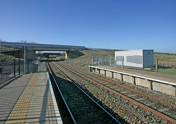 ![]() Ridgmont station looking south-west from the end of the up platform in February 2014. The 2008 A507 Ridgmont relief road is seen close to the end of the platforms. Husborne Crawley Halt which closed in 1941 was on the far side of the bridge seen in the distance.