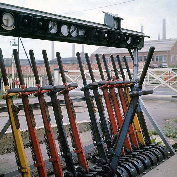 Ridgmont signal frame in September 1969, The brickworks in the background is now the site of a large Amazon distribution warehouse.