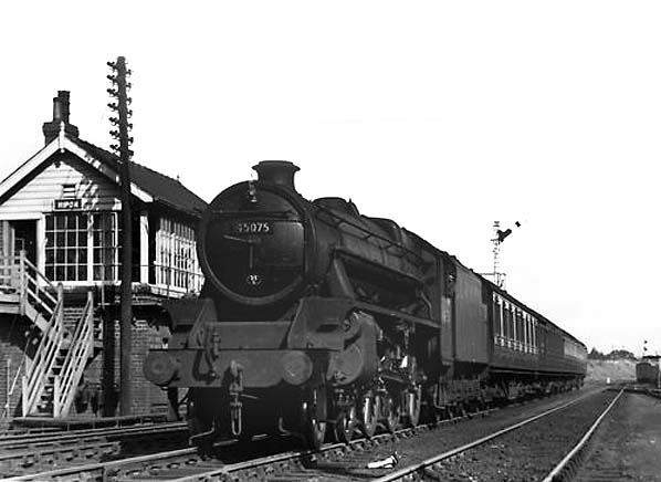 ![]() A southbound local train approaching Ripon in September 1954. The loco is 45075, an ex LMS class 5, 4-6-0, commonly known as a Black Five. Designed by William A Stanier, the loco was built at Vulcan Foundry works in February 1935, one of 100 black fives built there. Upon nationalisation, it was reclassified, BR 5MT along with the rest of the 842 black fives transferred into BR stock. The loco is on a class B stopping train, denoted by the single lamp on the top bracket. The Black Fives had a reputation for go anywhere, do anything locos, at home on local goods as well as express passengers and were regularly recorded at 90mph. Following withdrawal from Normanton shed (20D) on 30.9.67, it was cut up at Cashmores of Great Bridge on 30.4.68. There are 18 Black Fives preserved and they are popular on preserved railways as well as mainline railtours.