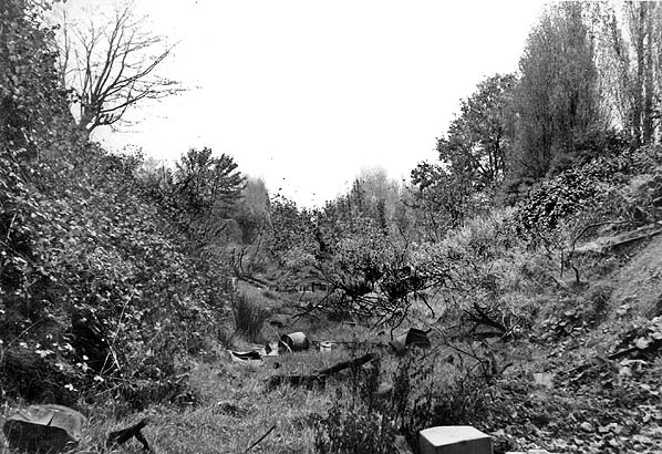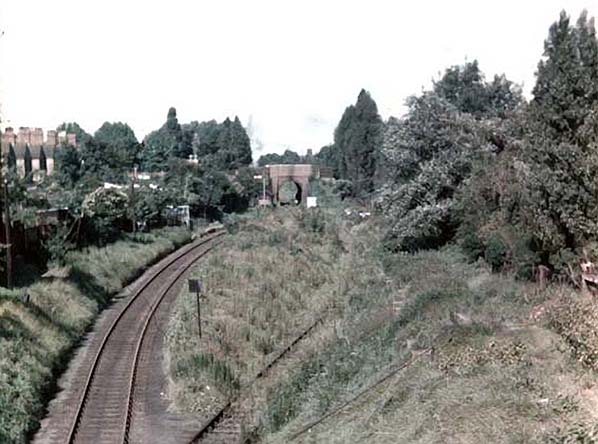 Photo by W A Camwell ![]() The station viewed looking north-east following its closure in 1934 the buildings were quickly demolished and it looks as though the original line, to the right of the platform has been taken out of use. Photo by C J Williams ![]() An interesting shot taken during July 1956 from Rotton Park Road showing the degraded platform and the original line still in situ although heavily overgrown.