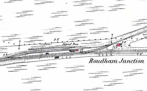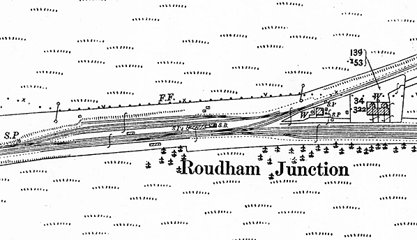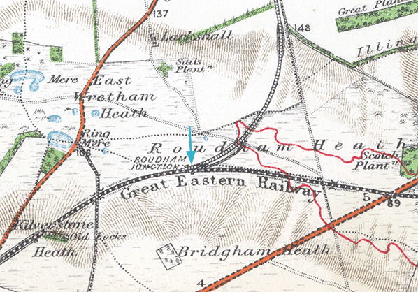 Notes: At Roudham Junction the branch line to Watton and Swaffham left the Thetford to Norwich main line. A Bill allowing construction of the Norwich & Brandon Railway was granted Royal Assent on 10 May 1844 and work began the same year. Some writers, in detailing the history of the Great Eastern Railway, assert that a station was built at Roudham, lying east of Thetford and west of Harling stations and opened at the same time as the line on 30 July1845. The Thetford & Watton Railway was granted consent to build a railway from Roudham to Watton in the mid 1860s. It opened to goods traffic in January 1869 and to passengers in October of that year. It has been said that at the same time Roudham station was renamed Roudham Junction. A station at this location was not accessible to the public other than by the railway. This fact possibly throws up some questions as to the accuracy of historical accounts and the reason for constructing a station there before it became a junction. There is no evidence that Roudham Junction offered a service to the public for the carriage of goods. Old maps show no goods facilities and the absence of roads further bears this out. Goods traffic to and from the branch was no doubt shunted and possibly transferred at the station. In 1932 the daily goods was worked from King’s Lynn, departing at 7.45am and terminated at Roudham, returning from there at 2.15pm.