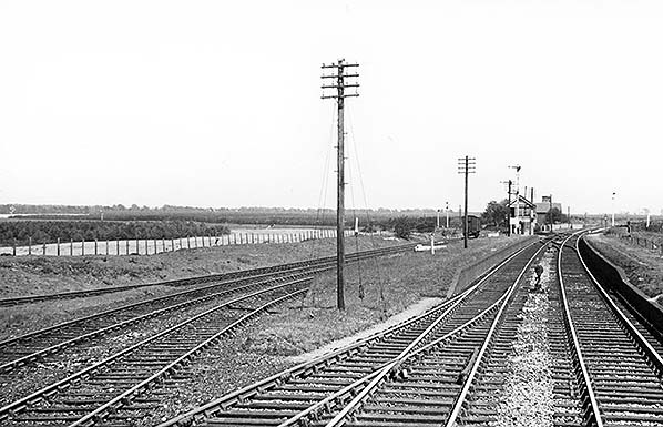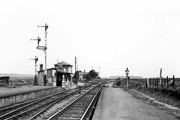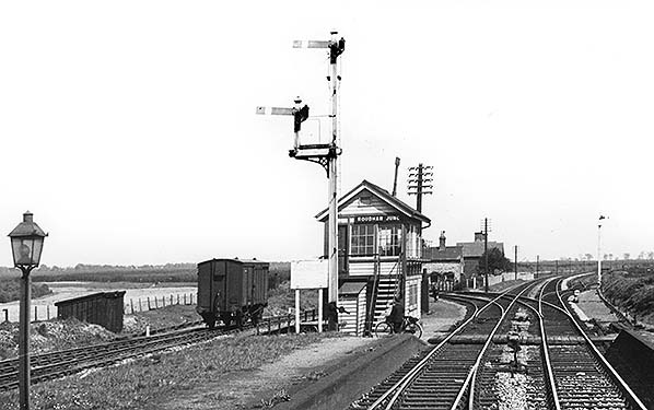 From 1 October 1902 Roudham Junction was advertised as an exchange station only, to be used by passengers changing trains to or from the branch line. The 1882 and 1905 OS 25in Maps show the layout of the station, as a junction, in some detail. The station lay in an east:west direction. On the south side of the main line there was a platform with a small building that was probably a shelter. The other platforms were on each side of an island on the north side of the main line. A large signal box was constructed at the east end of the island. Beside it, seen in photographs from the 1920s, was a smaller building to its west, adorned with advertisements, that probably served as the station office.; this building had gone by the 1950s. Access for trains using the branch line was from the west, the Thetford direction. Through trains heading to and from the branch had to use the main line platforms. Trains from the Swaffham line terminating at Roudham Junction could use the north side of the island which did not have direct main line access for through trains. This platform did not have as good a finished surface as those serving the main line which suggests that it was little used by passenger trains. This platform’s line went into a head-shunt from which there was access to a run-round loop on the north side or to the main line in an easterly direction. There was also a siding that was shunted from the branch. Just to the east of the station another siding lay alongside the up main line entered from a trailing point. The branch left the main line platforms as double track but that lasted a very short distance before becoming single line. In the ‘Y’ formed by the junction there was a row of railway cottages. The platforms were lit by oil lamps.