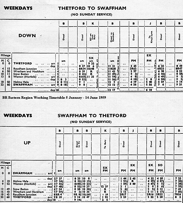 The final timetable in force before closure of the line to passengers shows five through trains in each direction. In addition there was an 8.00 am Watton to Swaffham service. An 8.20 am Thetford to Watton train returned from the market town at 8.49 am after a five minute stop. There was no Sunday service.