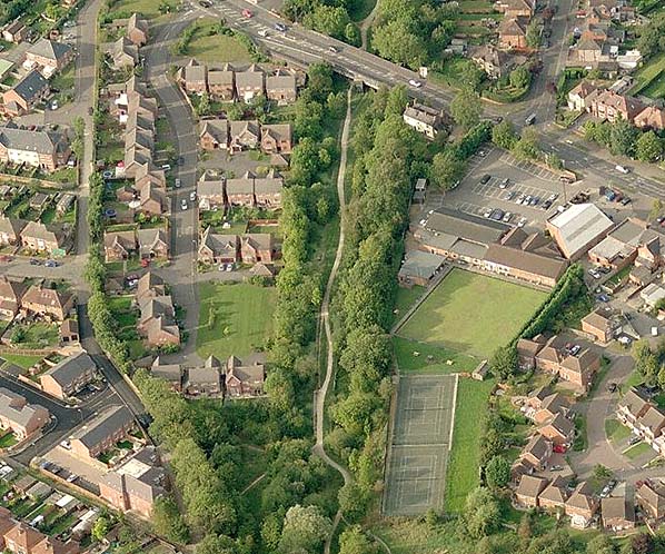 Recent aerial view of Rugby Central Station. The platform is clearly visible, the goods yard was to the left, thais has been replaced by new housing.