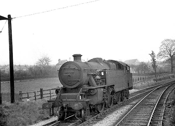 A view taken at the south end of Ruthin Station on the 28th April 1962 shows a locomotive that is running around its train.