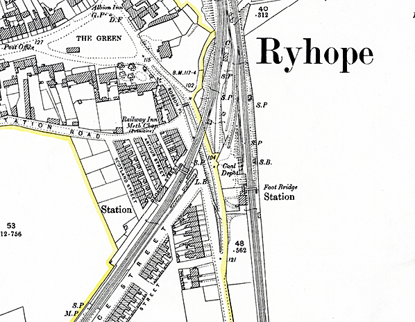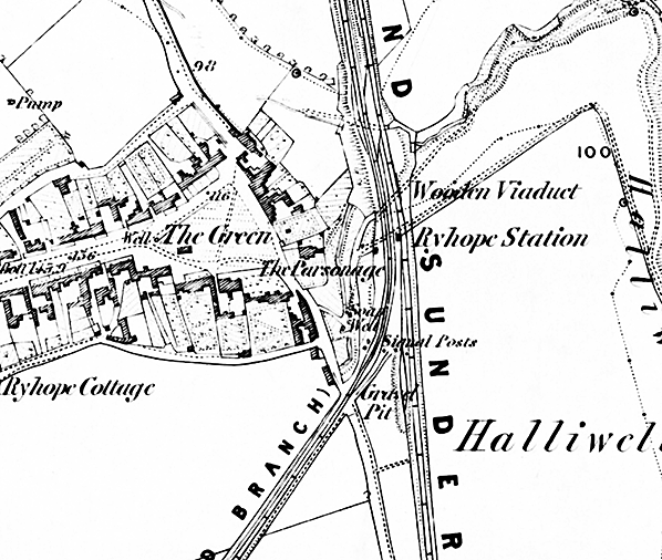 There is considerable doubt as to whether the Londonderry Railway opened a station at Ryhope with the line on 1 July 1855, despite reference to it in Col. Yolland’s inspection report, mentioned above. The Ordnance Survey 1: 10,560 map surveyed in 1856 and the 1: 2,500 published in 1875 refer to Ryhope station (singular) at NZ414529 immediately north of the point where the NER (ex D&S) and Londonderry lines converge to run alongside each other towards Ryhope Grange Junction. Quick (2009) argues that the NER’s station, which opened with the line on 19 October 1836, will have remained open thereafter, although it was not listed in Bradshaw timetables until June 1858; early timetables, notably in north-east England, sometimes omitted stations which are known to have been open (as between Newcastle and North Shields). However, Bradshaw of January 1858 states that the Londonderry Railway’s 12.55 from Seaham ‘meets the D&S trains at Ryhope’ and Quick suggests that the timing would not have allowed anything beyond a change of platforms at this point, implying that both railway companies had adjacent stations at NZ414529. It is possible, however, that some form of conveyance was provided between the NER and LR stations if the LR had opened what was to become Ryhope East. This note was absent from Bradshaw of January 1859, by which time it is well established that the Londonderry station at NZ414527, about 11ch south of the (NER) site shown on the 1856 / 1875 maps, was in operation.