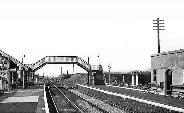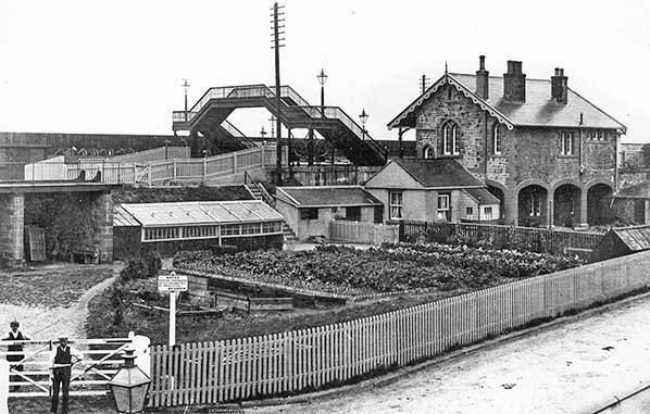 The building at Ryhope (LR) station, opened in 1858, was designed by Brewer, the Marquess of Londonderry’s Estate Clerk of Works. It was a charming and most unusual structure on the down (Sunderland-bound) platform with some mildly Gothic features. Because the railway was elevated, the lower of the two storeys was built against the embankment with only the upper storey at platform level. Uncoursed stone was used in its construction. Openings were an assortment of rectangular and pointed-arch shapes. The lower storey was recessed behind broad arches, and the upper storey was topped with a slate pitched roof carried forward over the platform to provide shelter and supported by four pillars linked by thick, arched brackets. Attractive bargeboards were provided with a wavy profile, pierced by quatrefoils, and there were pointed finials at the apex. On the up platform the timber waiting room block was similar to NER pent-roofed designs but with a central circular-arched entrance. The two facing platforms were 192yd in length connected at the northern end by a footbridge which, being of Londonderry Railway origin, was unlike designs found at NER stations.