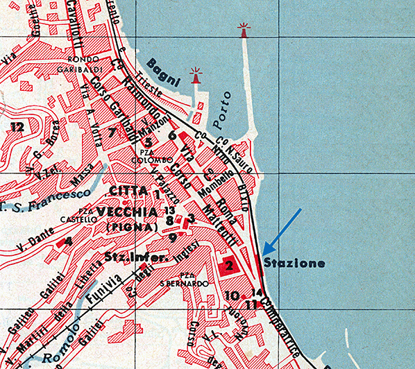 San Remo Station Gallery 1: December 1874 - 3 May 1939 ![]() The earliest known illustration of Sanremo station dates from December 1874 less than three years after the station opened. Tsarina Maria Aleksandrovna arrives at Sanremo from Nice, where she is welcomed by Duke Amedeo of Savoy-Aosta, son of Vittorio Emanuele Il. The station building seen here is completely different than that seen in photographs taken around the turn of the 20th century so would be completely rebuilt within a few years. No platforms are seen here but that could be artistic licence. There appears to be a short canopy but this might be a temporary, provided for this occasion in the event of bad weather. A water tank and tower is seen on the far left. The station sign shows the original spelling, S.Remo or San Remo. It wasn't renamed San Remo until the 1980s. The building to the left of the station is not seen in any photographs. The locomotive has probably also been altered by the artist. It appears to have an open cab with spectacle plate. It does however resemble products supplied to Italy by Robertson Stephenson and Co. These were mostly 2-2-2 inside cylinder types but there were a small number of 2-4-0 outside cylinder types.